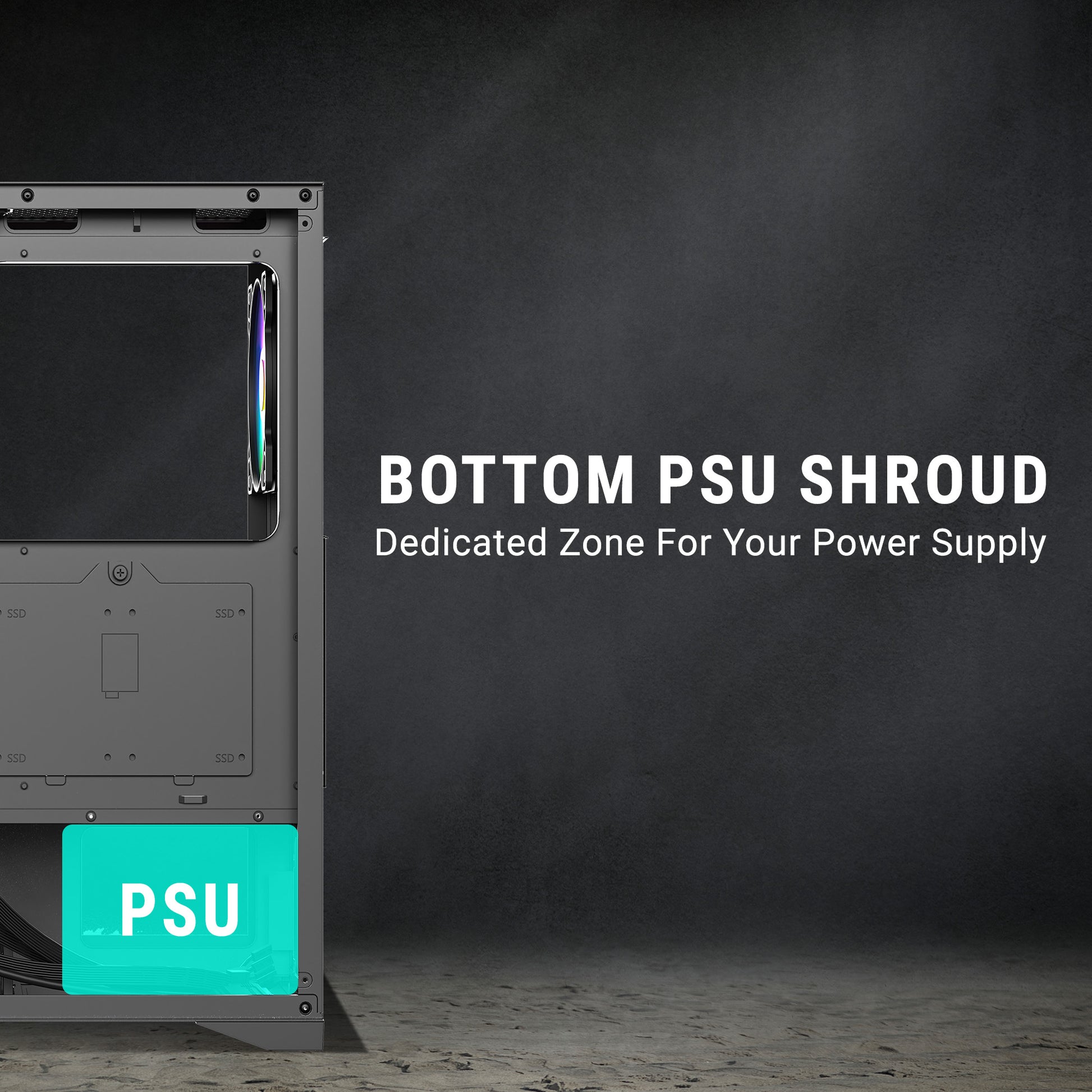 This case features six pre-installed 120 mm static RGB fans arranged for effective airflow across the front, bottom and rear. It supports a GPU length of up to approximately 340 mm, and a CPU cooler height up to around 165 mm, making it compatible with modern hardware. The design includes a tempered-glass side panel (Glass front variant “G”), and a mesh-front variant for extra airflow (non-“G” version) so you get style or performance as preferred.