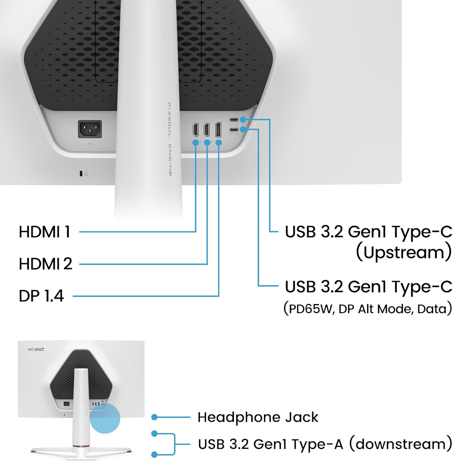 Connectivity: 2 × HDMI 2.0, 1 × DisplayPort 1.4, 1 × USB-C (65 W Power Delivery + DP Alt Mode + Data), USB hub ports