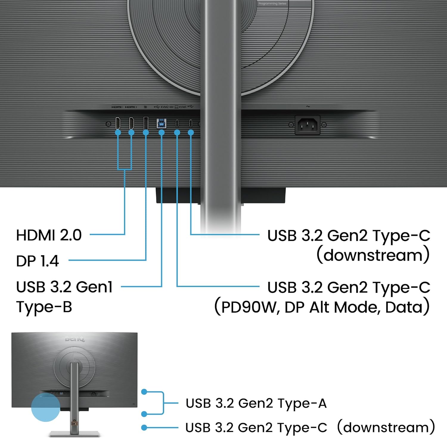 Inputs & Connectivity: 2× HDMI 2.0, 1× DisplayPort 1.4, 1× USB-C (DP Alt Mode + data + 90 W PD), USB upstream and downstream hub ports