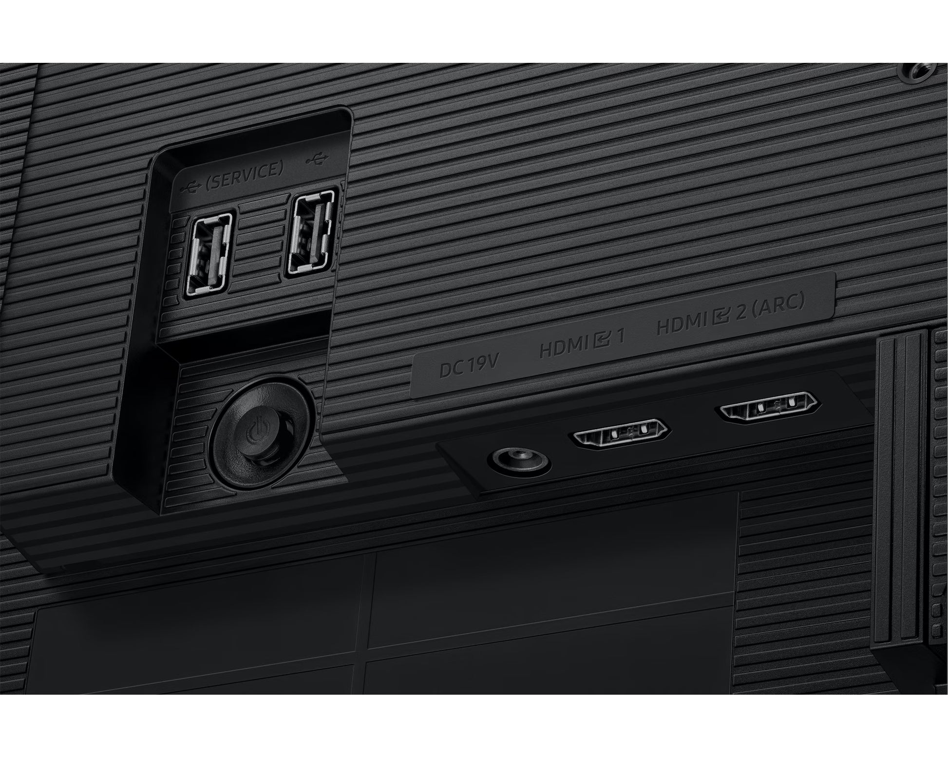 This monitor works with any desktop or laptop with HDMI output (1920×1080 @ 60 Hz) for standard use. To access the smart features, a WiFi connection and Samsung account may be needed. For wall-mounting or mounting on a monitor arm, a case with VESA 100×100 mount holes is required. A free HDMI port is sufficient for display connectivity; built-in speakers mean no additional audio cables are required unless you prefer external sound.